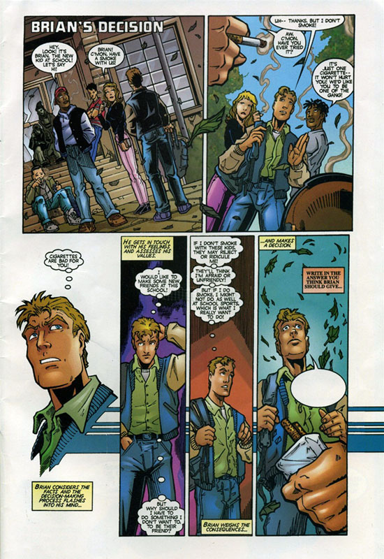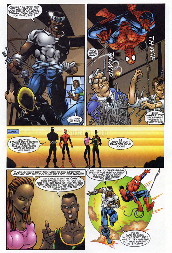 As Spider-Man, Peter recruits the X-Men's Storm to trail a couple of suspicious fellows who are supplying cigarettes to Bret and other kids!